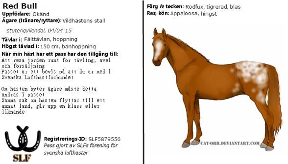 Övrigt: Red Bull är en fantastisk hopphäst, och fast han är en liten häst så hoppar han dom allra högsta hindrena och älskar att hoppa. Han är rätt snäll att hantera, men han kan bli lite ivrig när han ska ut och ridas. Han är helt orädd, och är väldigt känslig i munnen, vilket man kan märka om man håller för kort tag i tyglarna för då skakar han på huvudet och försöker visa vad som stör honom. Och han tål inte att bli hårt behandlad.